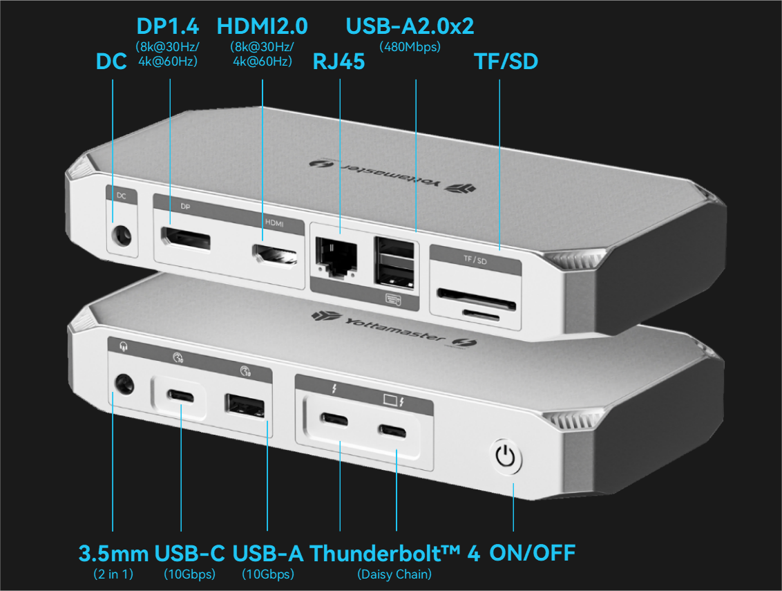 Yottamaster 12- port Thunderbolt™ 4 Dock supports connecting multiple devices simultaneously. Seamlessly transfer data and charge devices with lightning speed through a single cable. Prepare for the future with USB4 compatibility, meeting all your connectivity needs for years to come.