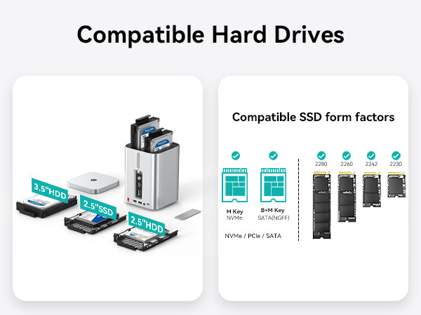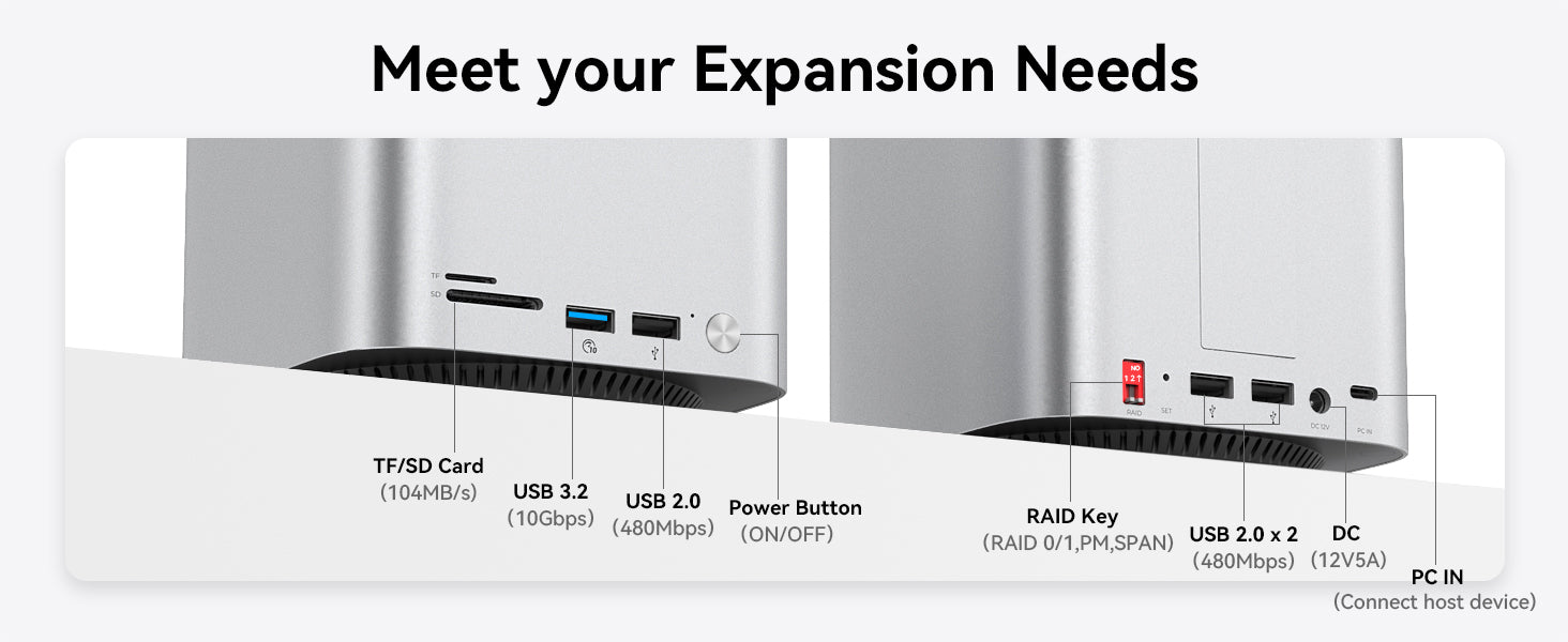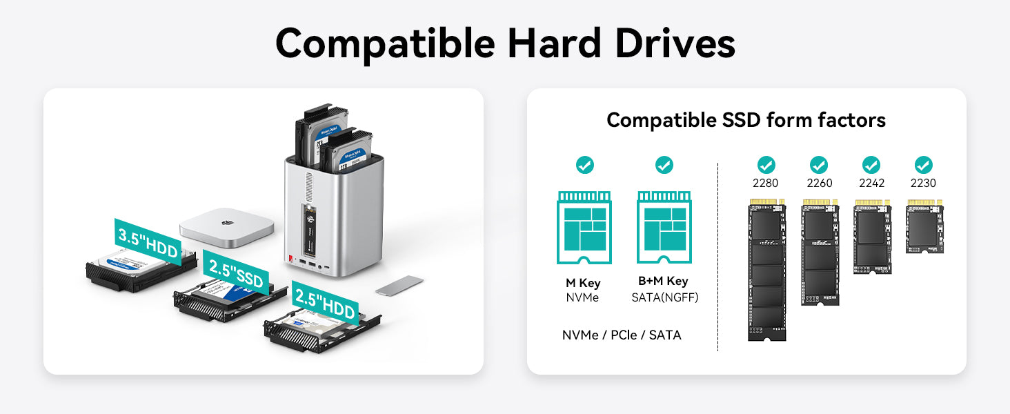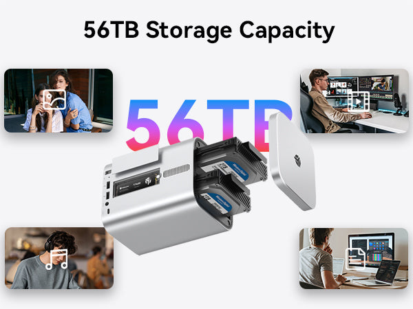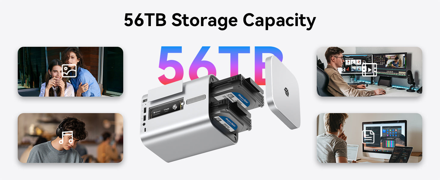 [Advanced Hybrid Storage Architecture ] The system accommodates two SATA HDD/SSD drives with a combined capacity of up to 24TB for bulk storage, paired with a single M.2 NVMe SSD (form factors 2230/2242/2260/2280) with up to 8TB capacity.