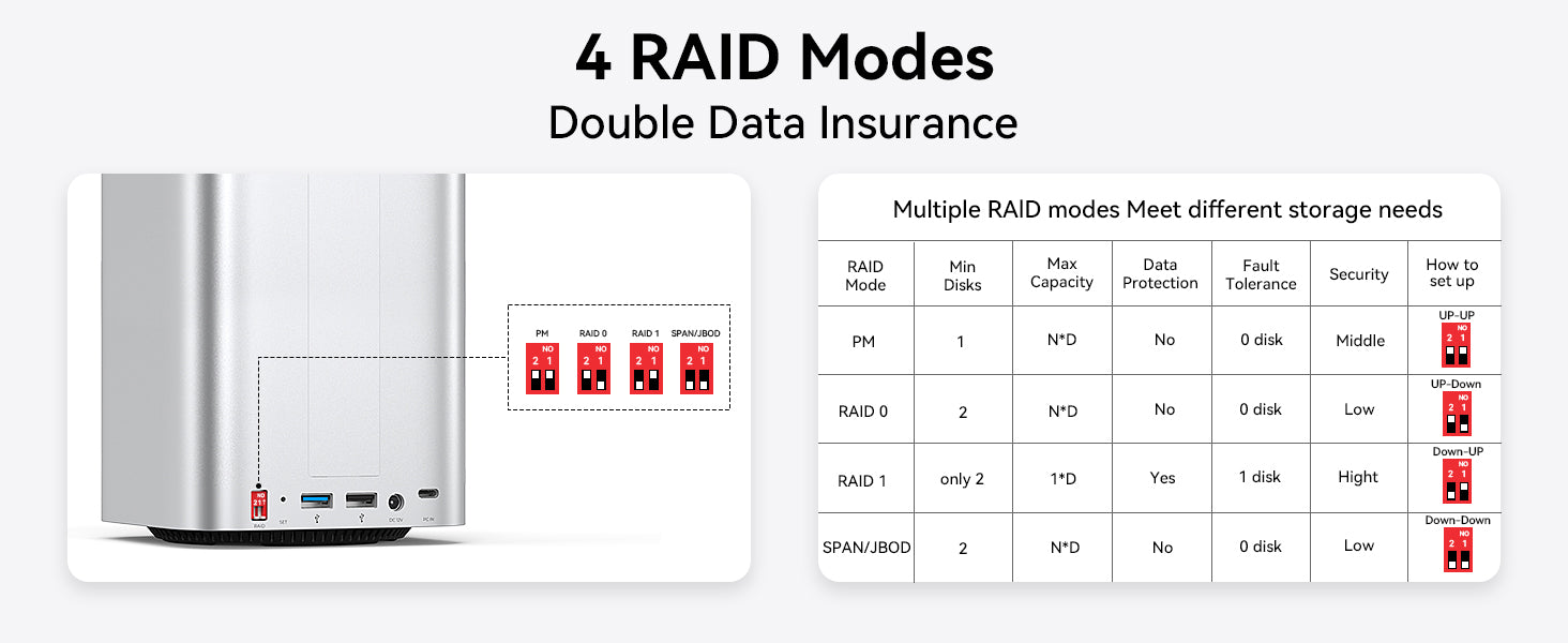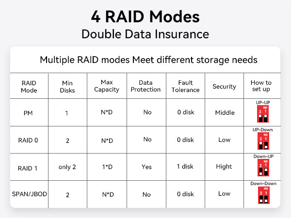 [Configurable RAID Modes for Data Management] The dual-bay SATA backplane offers flexible and secure data management through user-selectable RAID modes, including RAID 0 (striping for performance), RAID 1 (mirroring for redundancy), JBOD (spanning), and individual disk operation. Important Note on Configuration: The physical RAID mode selector switches on this unit operate in a reverse order (from bottom to top).